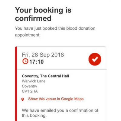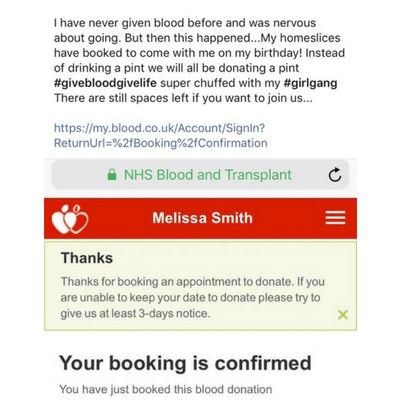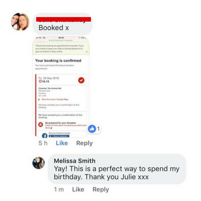 Feeling slightly overwhelmed but extremely happy I posted what we were planning to do on Facebook. More people responded and more appointments were made. Friends from Coventry around the UK got in touch over the next couple of days with stories of their own experiences of giving blood or to say they had booked an appointment.